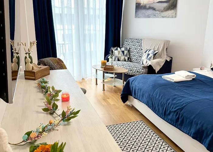 1-pokojowy apartament jest położony w Kołobrzegu, w ciągu prawie 10 min jazdy samochodem od Oceanarium i niedaleko od Plaży Wschodniej. Położony przy plaży AL-DOM Apartament Seaside z bocznym widokiem na morze i miejscem w hali garażowej jest zaledwie 25 min spacerem od centrum miasta. Obiekt mieści się 3 km od Kołobrzeskiego Skansenu Morskiego.